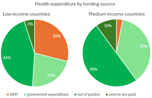 Despite all the successes, it is critical to keep the role of DAH funding in context (5). According to a study by the Center for Healthy Development (8), DAH represents a vital but modest share of the total health expenditures in low-income countries (LICs) and an even smaller share in middle-income countries (MICs) where the majority of the world’s poor live (see Figure 1). In 2019, 44% of health expenditure per capita in LICs was “out of pocket”, 22% was government expenditure for health, while 29% of the health expenditure came from DAH. In MICs, only 3% of health expenditure is sourced from DAH. Whilst progress on health in LMICs has been driven by domestic funding and action, international funding has been playing a much larger role in disease-specific programs and health gains, in particular HIV, TB, malaria and neglected tropical diseases (NTDs). and importantly often with earmarked funding for marginalised populations. Without such international funding the major progress in these areas would probably not have happened.