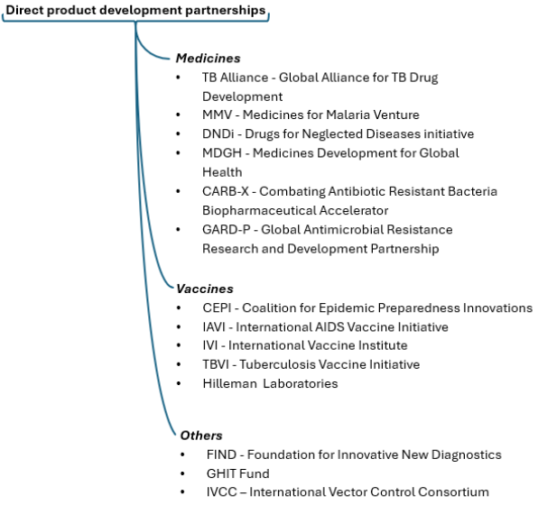 There is a plethora of global health PDPs, which were established to accelerate product innovation for various infectious diseases, for which there is often a lack of market incentives. Some are pure investors linked to governments (e.g. GHIT Fund in Japan, and RIGHT Fund in Korea), or as a multilateral funding mechanism such as CEPI (Coalition for Epidemic Preparedness Innovation). The Gates Foundation is a major funder (and co-founder) of many PDPs. Competition for funds is intense, in an environment of declining investments in infectious diseases product development in general.
